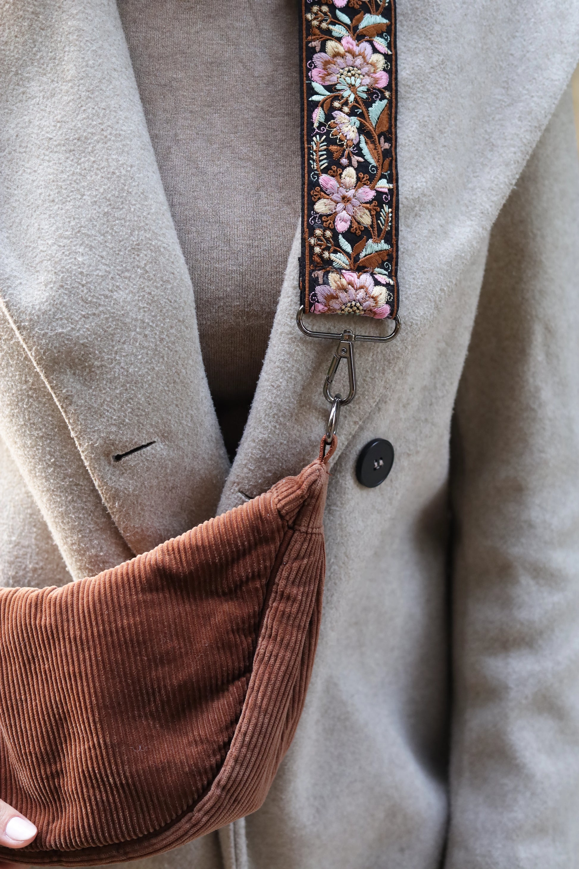 - Front: Embroidered fabric